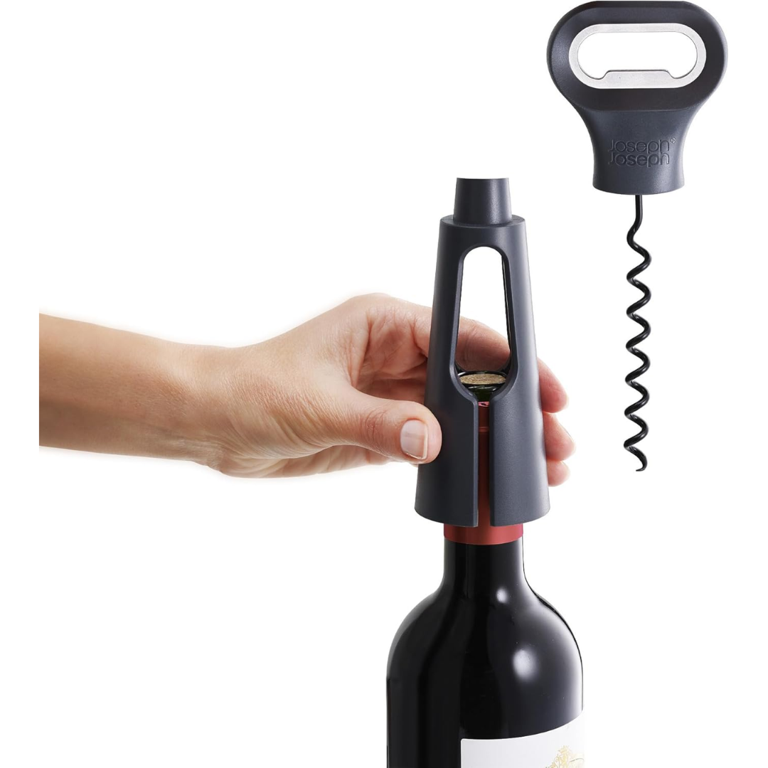 The Joseph Joseph Duo 3-in-1 Corkscrew (Grey) is a versatile, space-saving solution for wine lovers. This clever tool combines a high-quality corkscrew, integrated foil cutter, and bottle opener, making it perfect for opening wine, beer, and soda with ease.