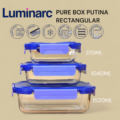 Luminarc Pure Box Putina Glass Storage Box with Lid 370ml – compact, airtight, and microwave-safe. Made in France, this durable glass container is perfect for snacks, salads, or lunch portions. Leak-proof with a clip-lock lid and valve for reheating.