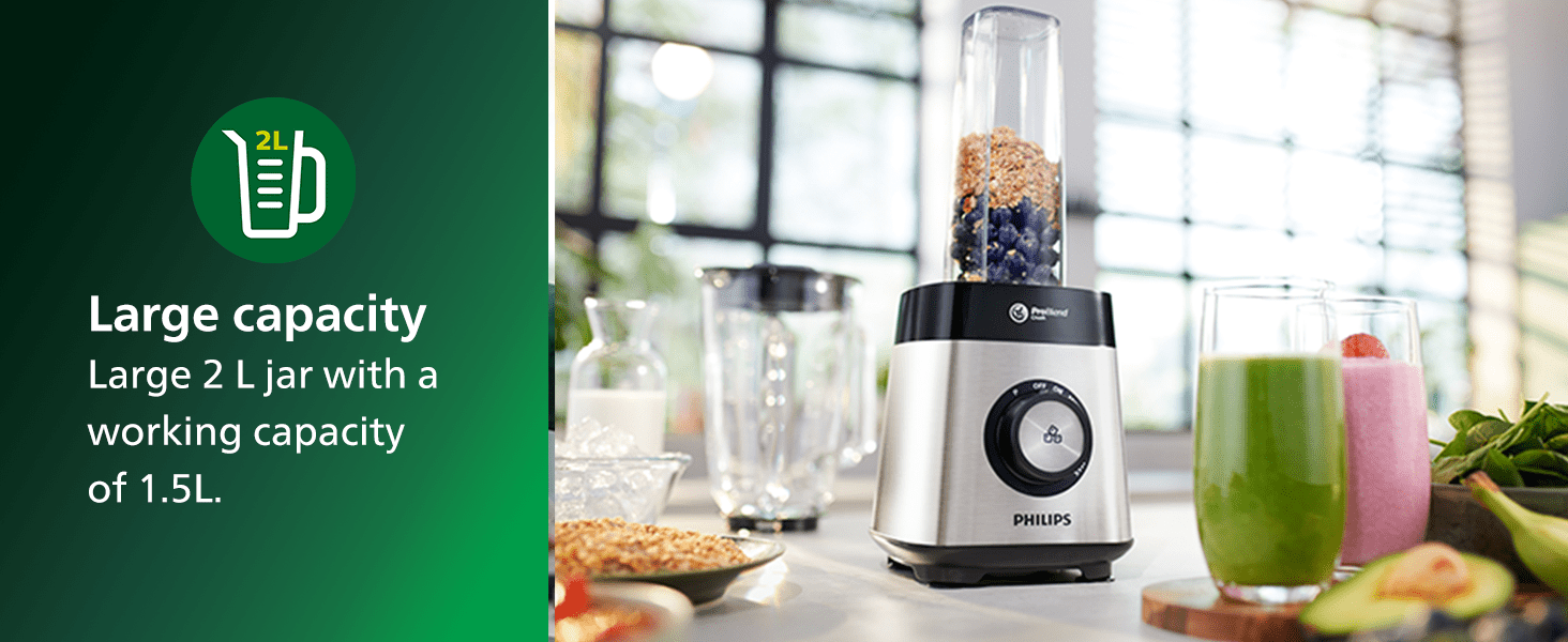 The large 2 L jar has a working capacity of 1.5 L for deliciously blended smoothies to share with the whole family or save for later