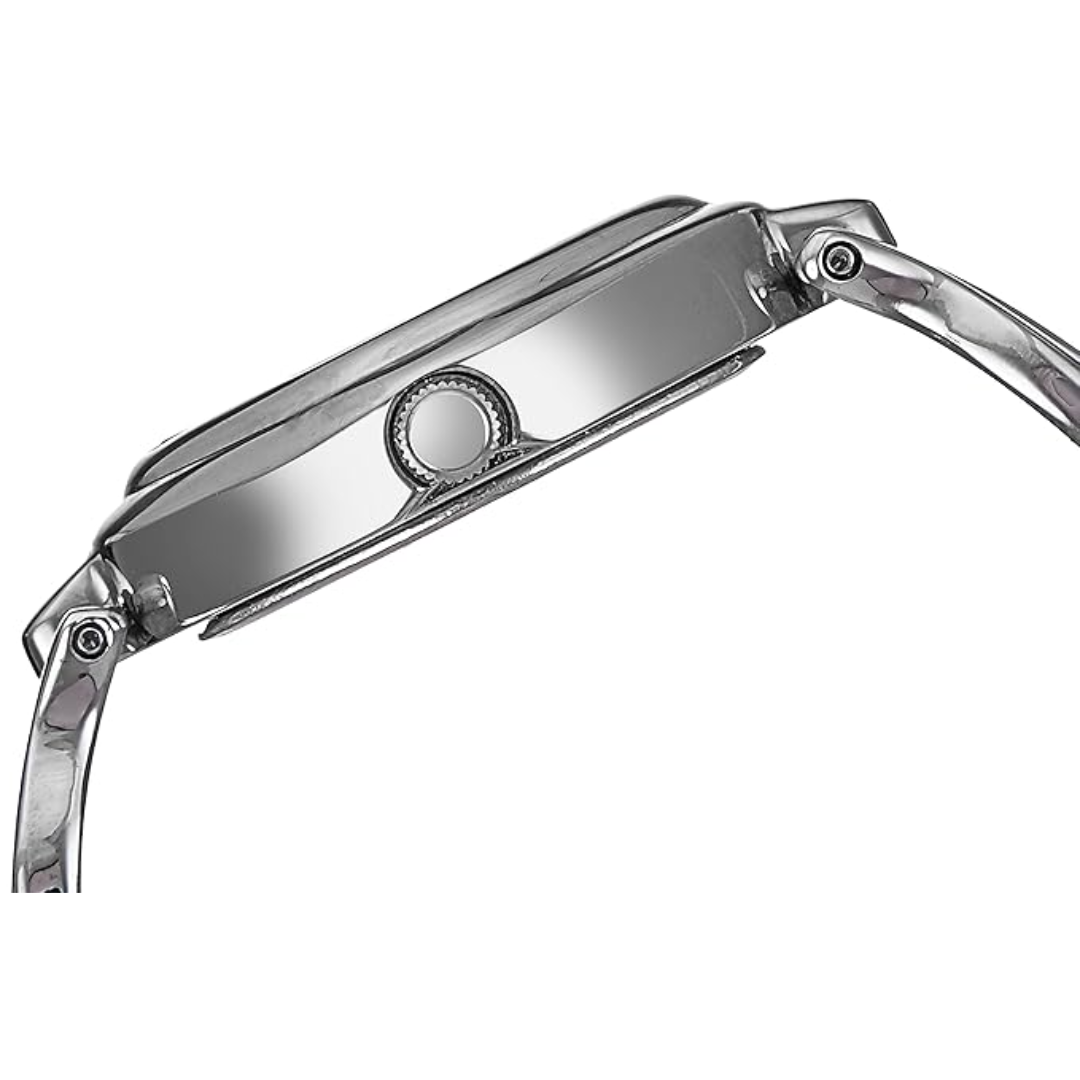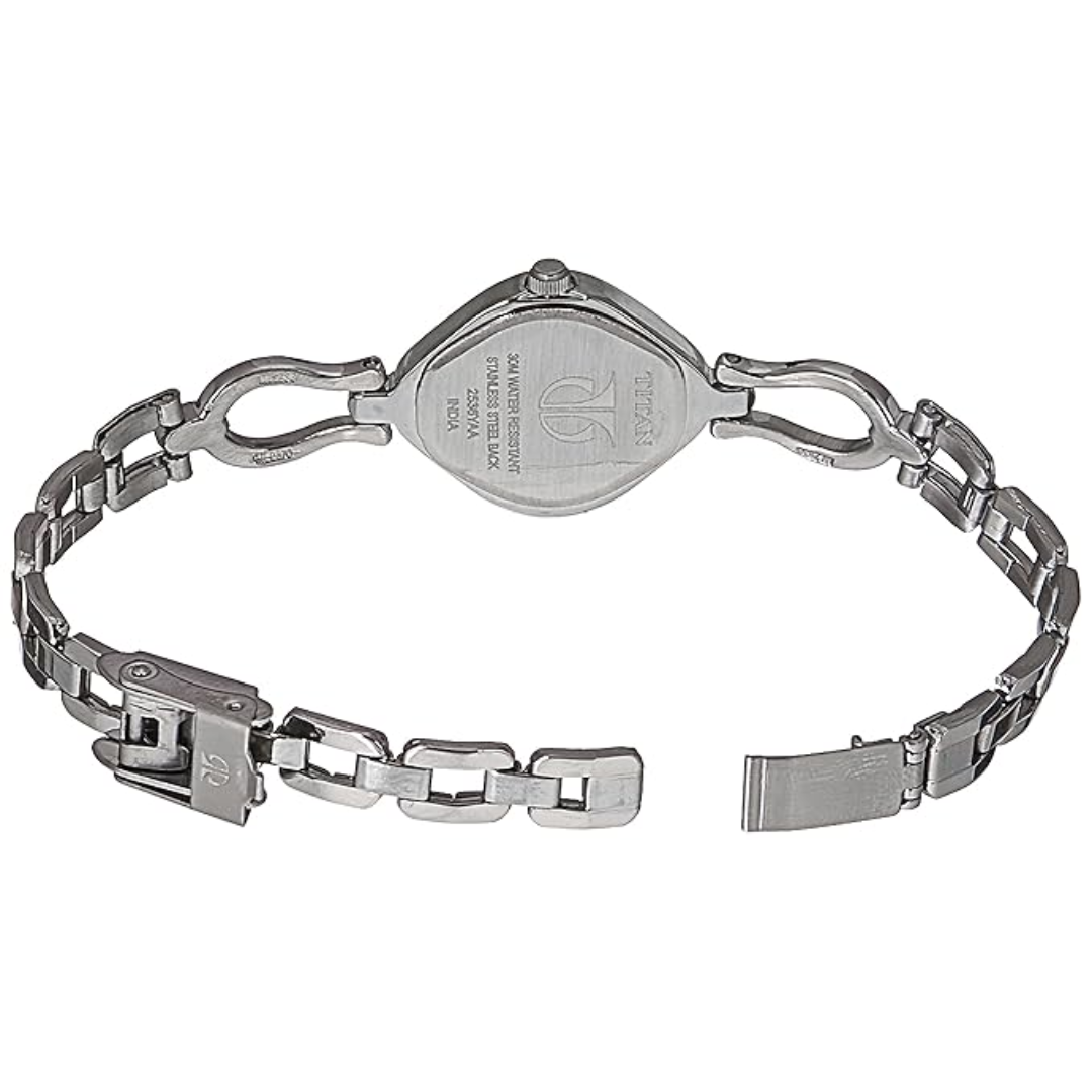 The Titan Silver Dial Analog Watch for Women is a graceful addition to the Titan Karishma collection, blending refined design with dependable performance. Its patterned silver dial, paired with plain three hands, creates a sophisticated and easy-to-read display. The navette-shaped brass case, enhanced with mineral glass protection, ensures durability while maintaining elegance.
