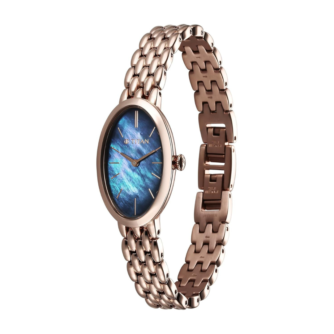 The Titan Aura Quartz Analog Mother Of Pearl Dial Stainless Steel Strap Watch for Women is a stunning luxury timepiece designed for elegance and sophistication. Featuring a radiant Mother of Pearl oval dial, this watch combines timeless beauty with precise functionality. The rose gold stainless steel strap enhances its charm, making it a perfect accessory for both everyday wear and special occasions.