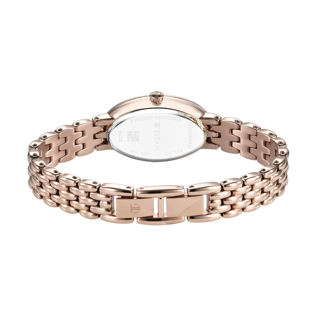 Crafted with durable mineral glass and powered by Quartz movement, this Titan watch ensures accurate timekeeping and long-lasting performance. Its 5 ATM water resistance adds reliability, while the jewellery clasp provides a secure and graceful fit. This watch is ideal for women who appreciate refined craftsmanship and stylish elegance.