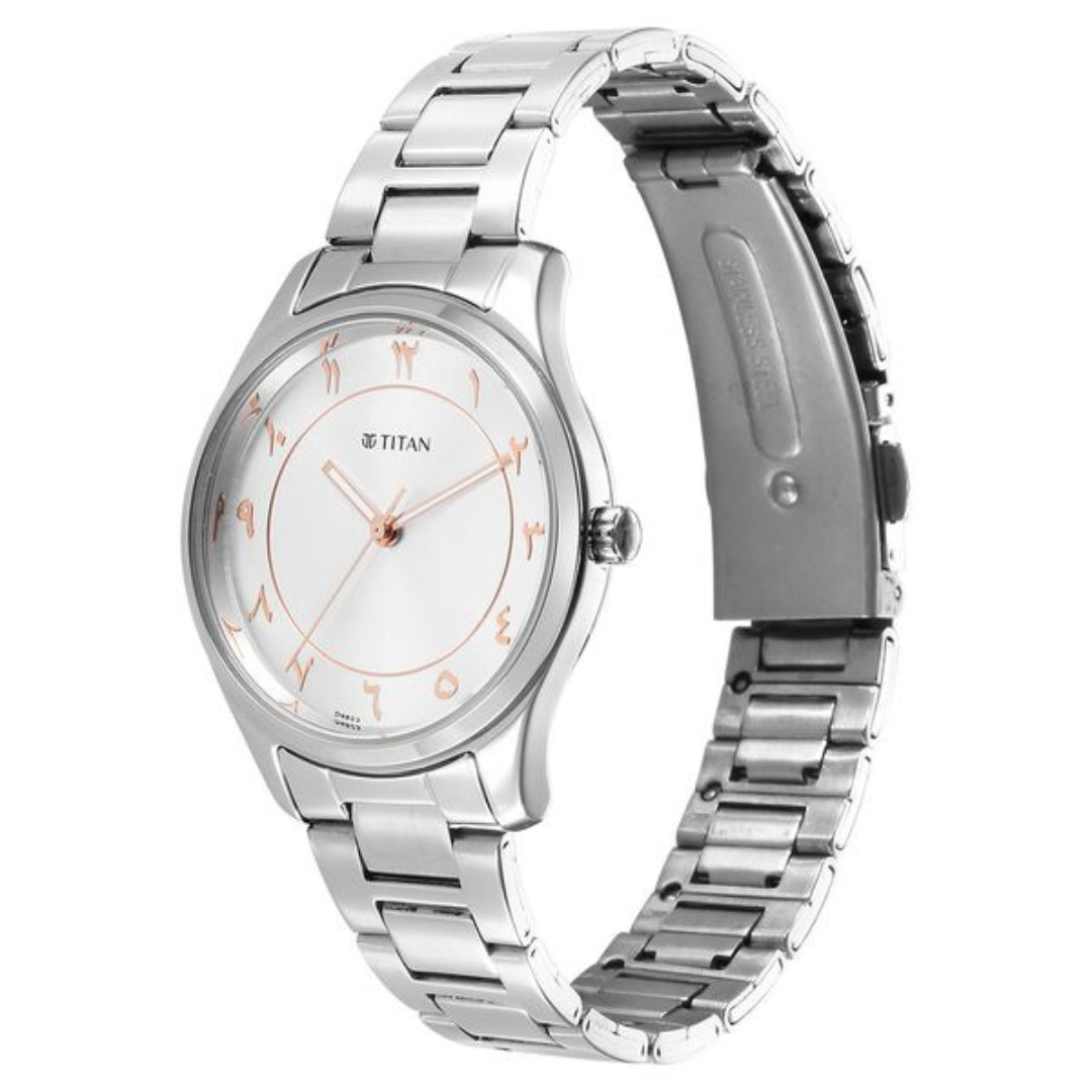 The Titan IBD Marhaba Ladies Watch is the perfect blend of elegance and timeless craftsmanship. Featuring a silver-white round dial with a plain 3-hand display, this analog watch captures simplicity in its most stylish form. The stainless steel strap adds a touch of sophistication, making it versatile enough for both workwear and casual outings.