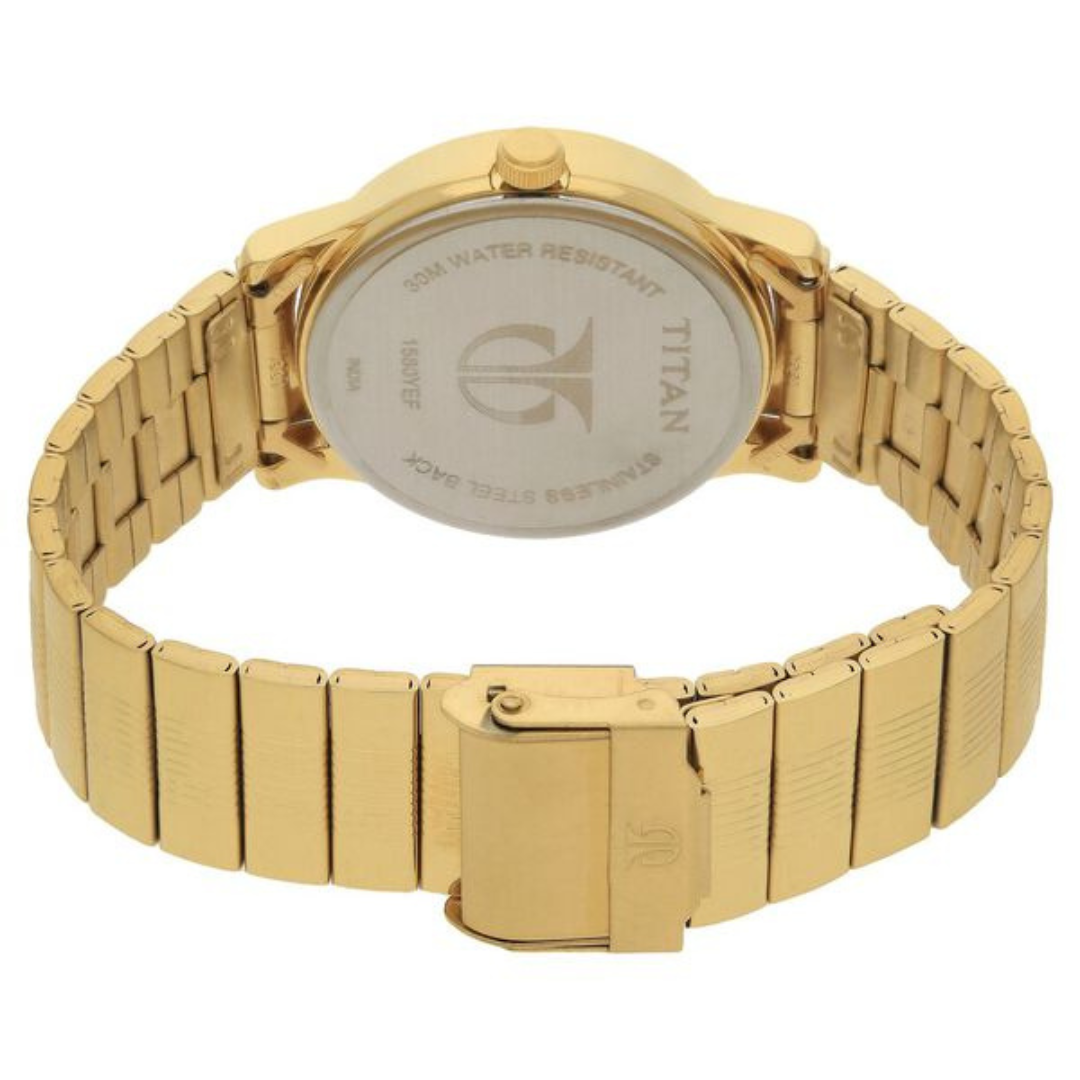 Crafted with a gold-tone brass case and paired with a durable stainless steel strap, this watch delivers comfort and class. The three-piece sliding clasp ensures a secure fit, while the mineral glass offers protection against scratches. Powered by Quartz movement, it guarantees reliable precision in everyday wear.