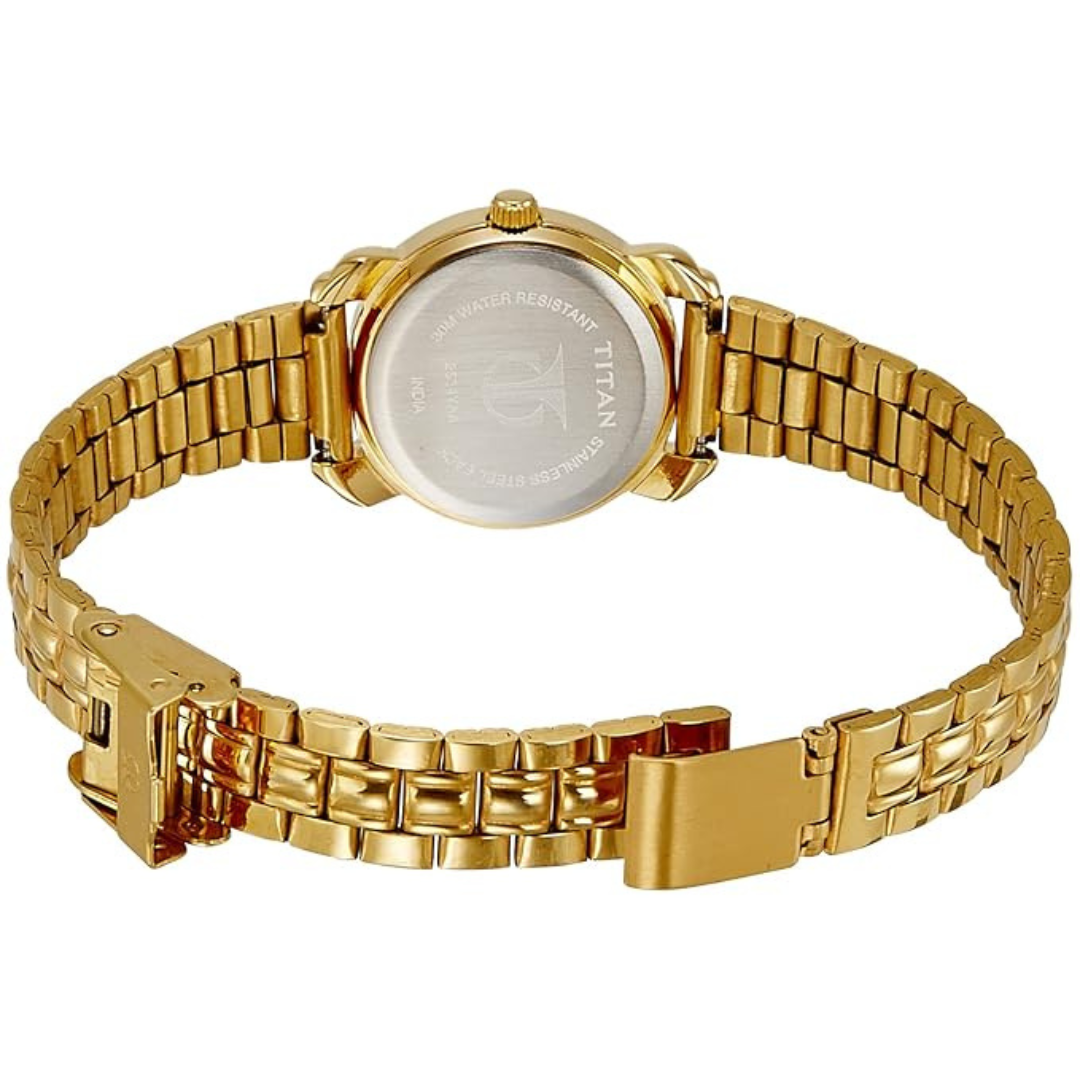 The Titan Karishma Champagne Dial Analog Watch for Women is a classic timepiece that combines elegance and durability, making it a must-have accessory for todayβs modern woman. Featuring a champagne-colored round dial with a subtle white design accent, this watch brings a refined touch to any outfit. The three plain hands and four gold indicators ensure effortless time reading at a glance.