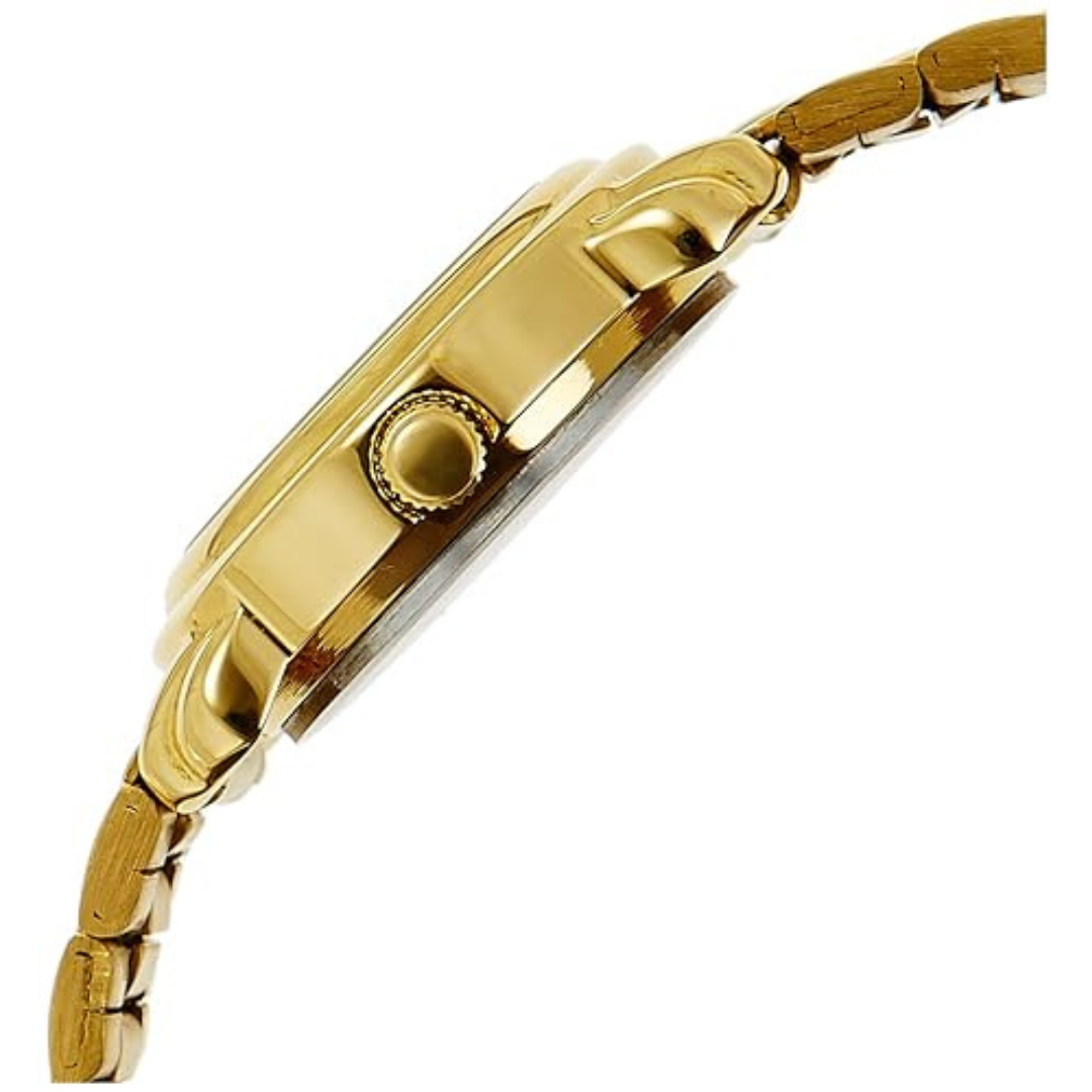 Encased in a brass case with mineral glass protection, it offers durability against daily wear while maintaining a sleek look. The gold-toned stainless steel strap, secured with a 3-piece sliding clasp, provides both comfort and long-lasting strength. Its quartz movement ensures precise timekeeping, while the 3 ATM water resistance keeps it safe from everyday splashes.