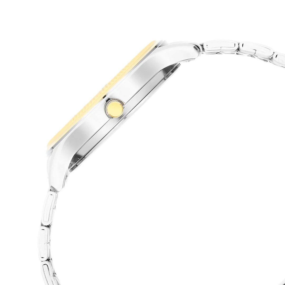 The two-toned stainless steel strap adds a modern touch, while the brass case enhances durability and luxury. Equipped with a single push-type clasp and 3 ATM water resistance, this watch is perfect for everyday wear. With mineral glass protection, your dial stays pristine for years to come.