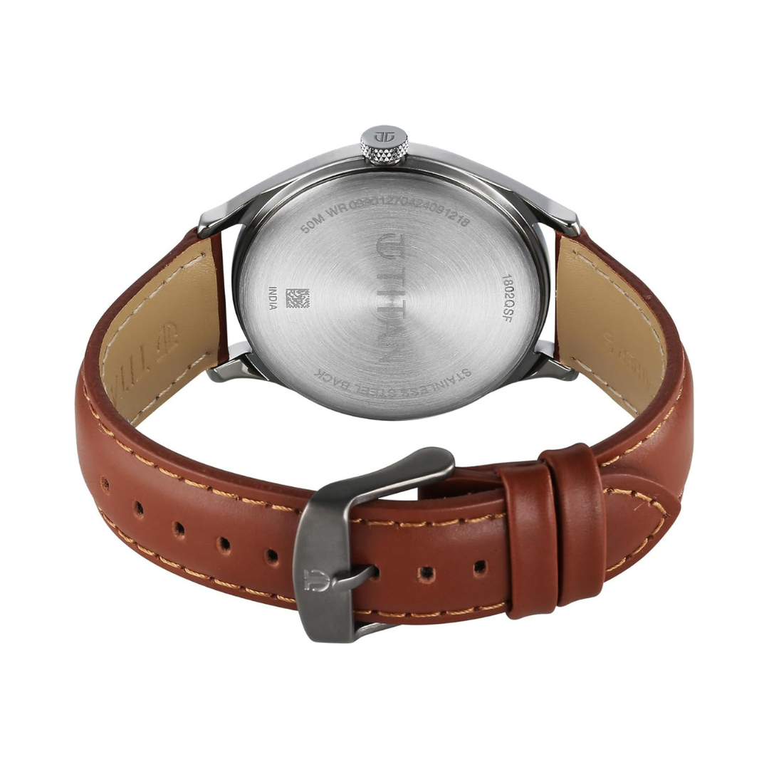 Powered by a Quartz movement, this Titan men’s watch ensures accurate timekeeping, making it a reliable companion for both work and leisure. Its durable brass case and water-resistant design enhance practicality, ensuring it’s built to last.
