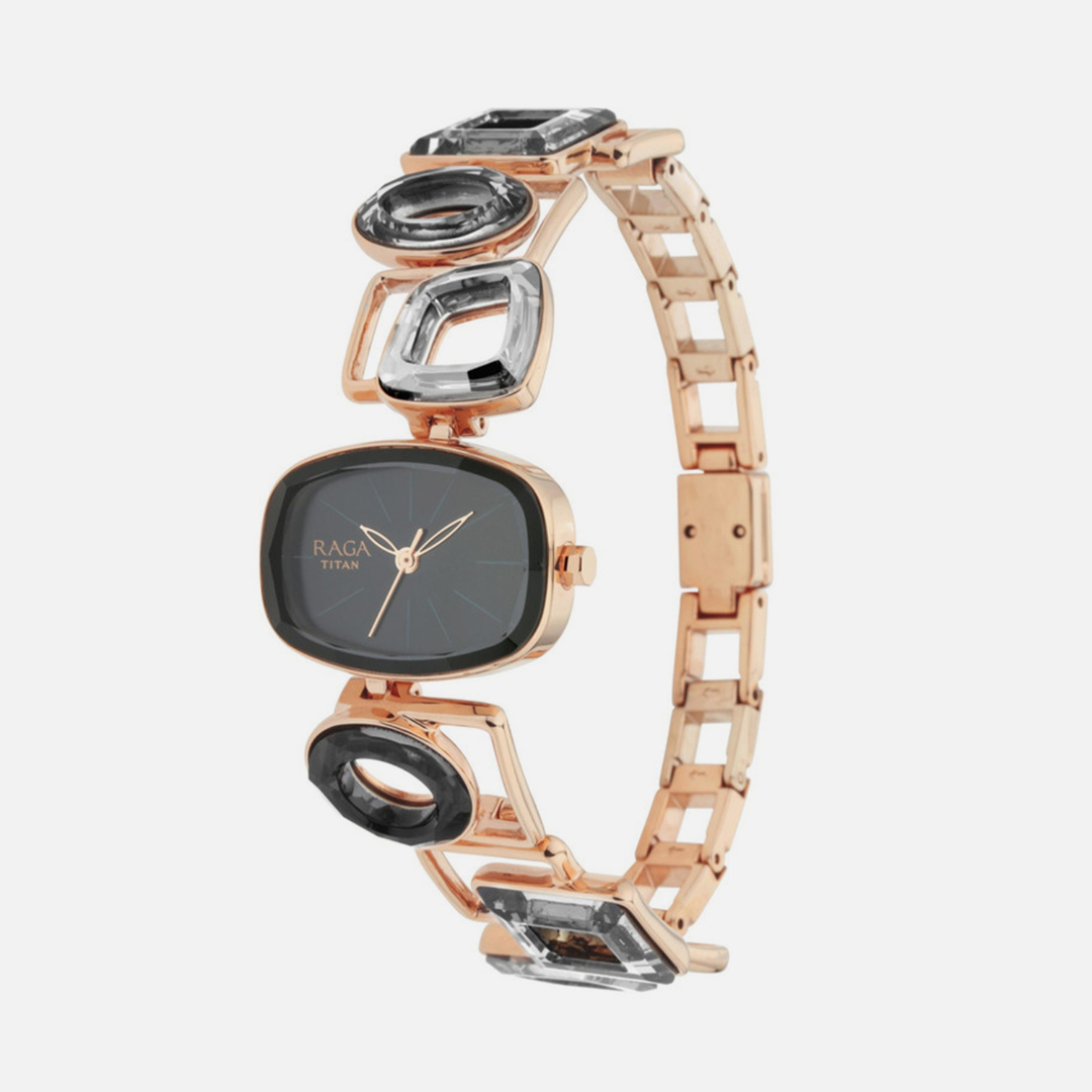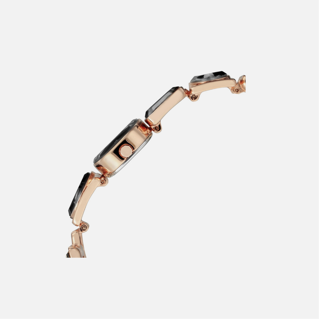 Crafted with a brass case and bracelet finished in a luxurious rose gold tone, it perfectly complements the black shaped dial that adds a touch of modern sophistication. The plain 3-hand quartz movement ensures precision, while the mineral glass protection keeps your timepiece looking pristine.