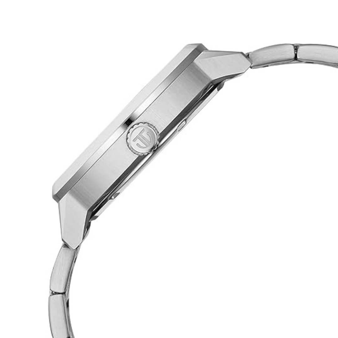 The Titan Regalia Arc Quartz Multifunction Blue Dial Silver Stainless Steel Strap Watch for Men combines contemporary design with practical functionality. Its uniquely shaped blue dial features a day, date, and second subdial, while the silver stainless steel strap with deployment clasp adds durability and a polished, professional look.