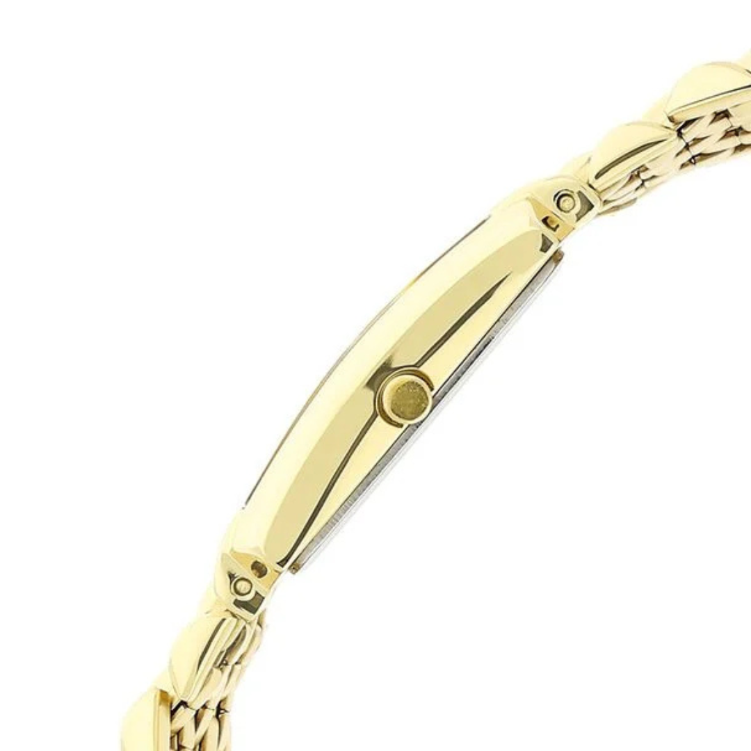Crafted with a gold-tone stainless-steel strap and a sturdy brass case, the watch delivers both durability and style. Its mineral glass covering ensures long-lasting clarity and protection from scratches, while the push-button clasp provides a comfortable, secure fit.