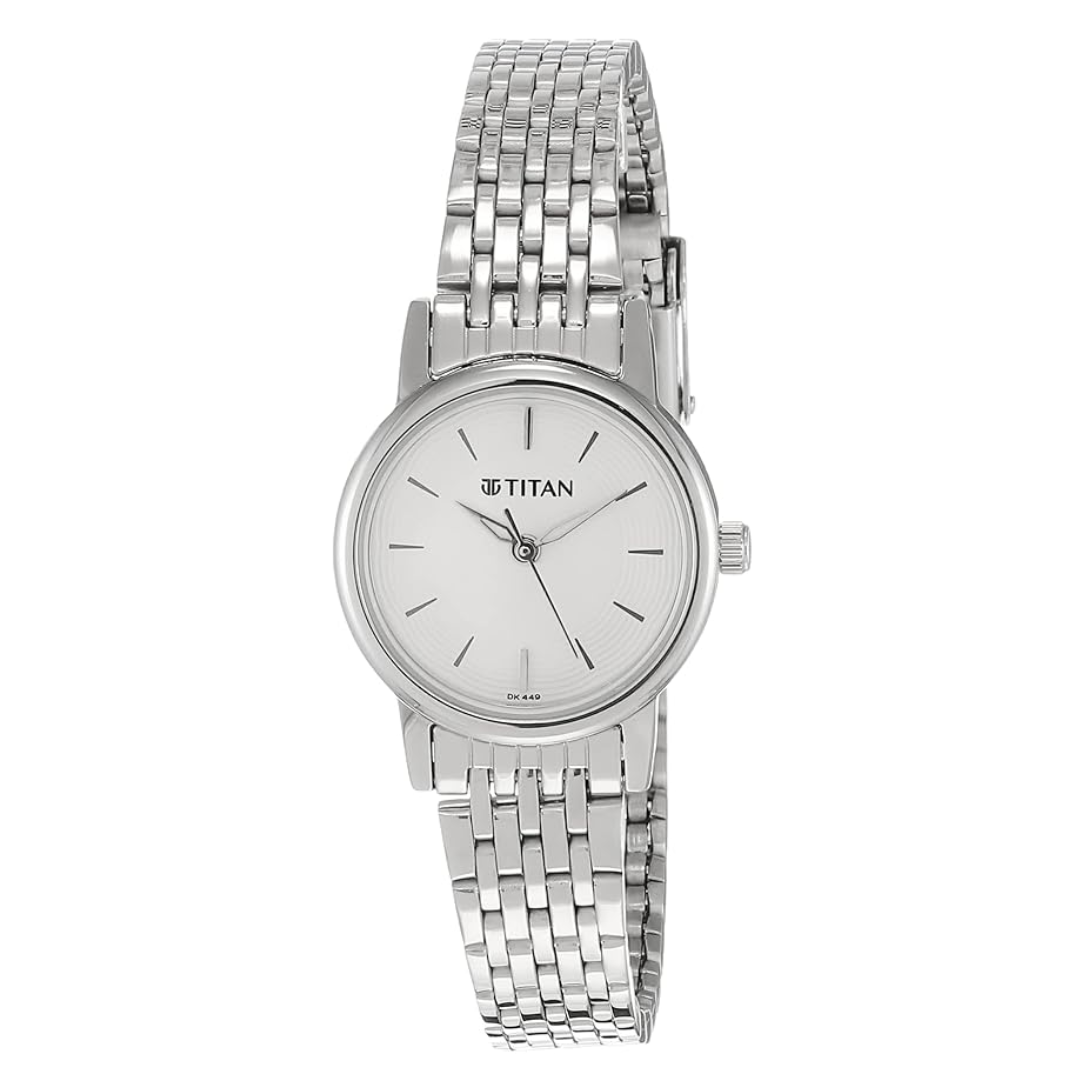 Its stainless steel strap, finished in a matching silver tone, complements the case seamlessly while offering comfort and durability. The sliding clasp ensures a secure fit, while the quartz movement delivers precise and reliable timekeeping. With 3 ATM water resistance, this Titan ladies’ watch withstands everyday splashes, making it as practical as it is stylish.